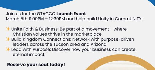 Whether you lead a large company, a small business, or a growing organization, your faith can be the foundation of how you serve, lead, and make an impact. The Greater Tucson Christian Chamber of Commerce (GTACCC) exists to unite business leaders who desire to honor God through their work and influence the marketplace with Kingdom values.